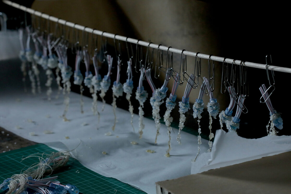 Men istedet for glas, så var krystallerne groet ud af sukker omkring LEDlyskilderne.